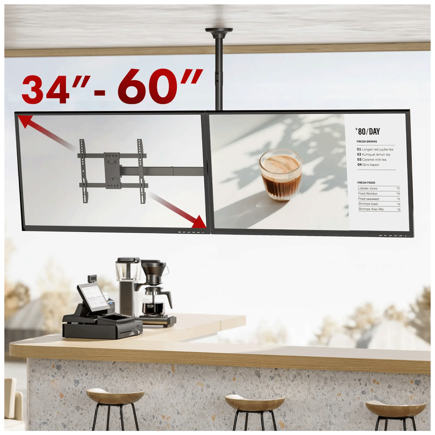 Instalacija je dizajnirana da bude jednostavna uz priložene vijke i nosače — dovoljno je pričvrstiti nosač za strop, montirati adaptere na TV-e, te spojiti i podesiti ekrane. Ovaj dizajn pogoduje situacijama gdje je potrebno dva ekrana gledati iz različitih uglova ili predstavljati simultano sadržaj.