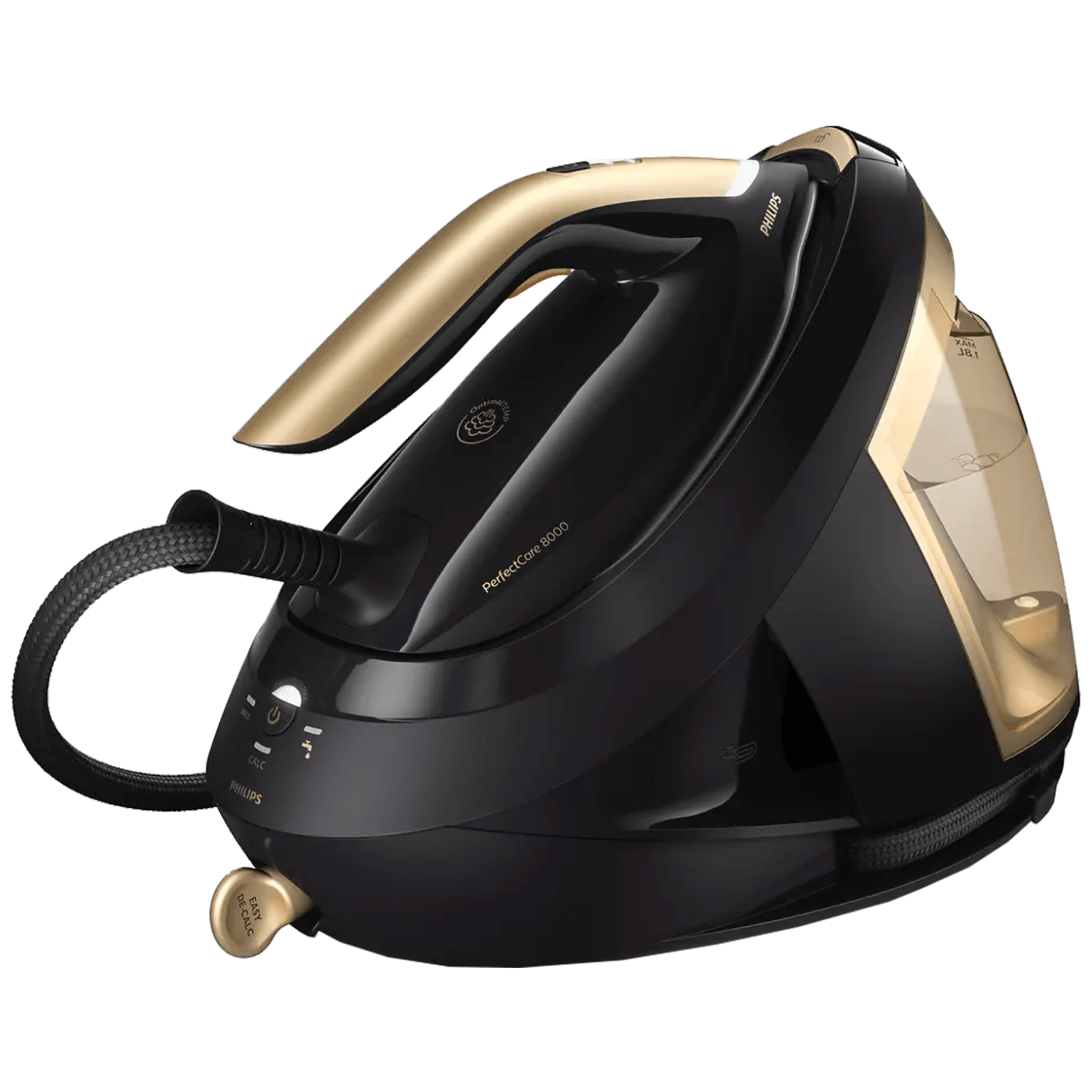 Serija PerfectCare 8000 omogućava glačanje bez napora uz pomoć naše nove tehnologije sa senzorom pokreta. Omogućava okomito i vodoravno glačanje uz automatsko otpuštanje pare. Speed mode funkcija prilagođava količinu pare vašoj brzini glačanja, za još brže rezultate. Snaga 2700W, neprestana para do 170 g/min, tlak max 8.5 bar, spremno za korištenje za 2 minute, dodatna količina pare do 700 g, trenutno stvaranje pare, kapacitet spremnika za vodu 1800 ml., dužina crijeva 1.8 met., sigurno za sve tkanine koje se mogu glačati, punjenje bilo kad tijekom uporabe