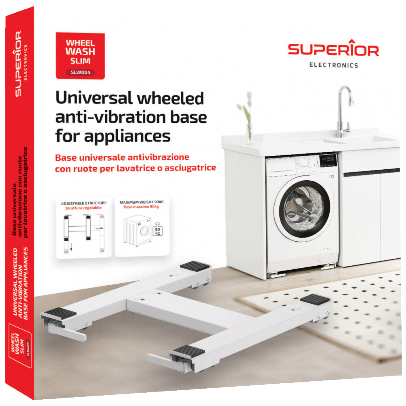 Superior Electronics Wheel Wash Slim je univerzalna antivibracijska baza sa kotačima namijenjena za perilice rublja, sušilice i druge kućanske uređaje. Dizajnirana je kako bi omogućila stabilan rad uređaja uz istovremeno smanjenje vibracija, buke i pomicanja tokom rada.