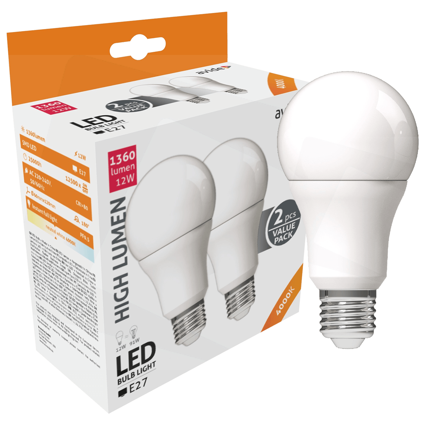 Sijalica A60, LED 12W, ekvivalent 91W, E27, svjetlost 1360 lm, temperatura svjetlosti 4000K, snop svjetlosti 180°, radni vijek 25.000 h., dimenzije Ø 60 x 120 mm, IP20, pakiranje 2 kom.
