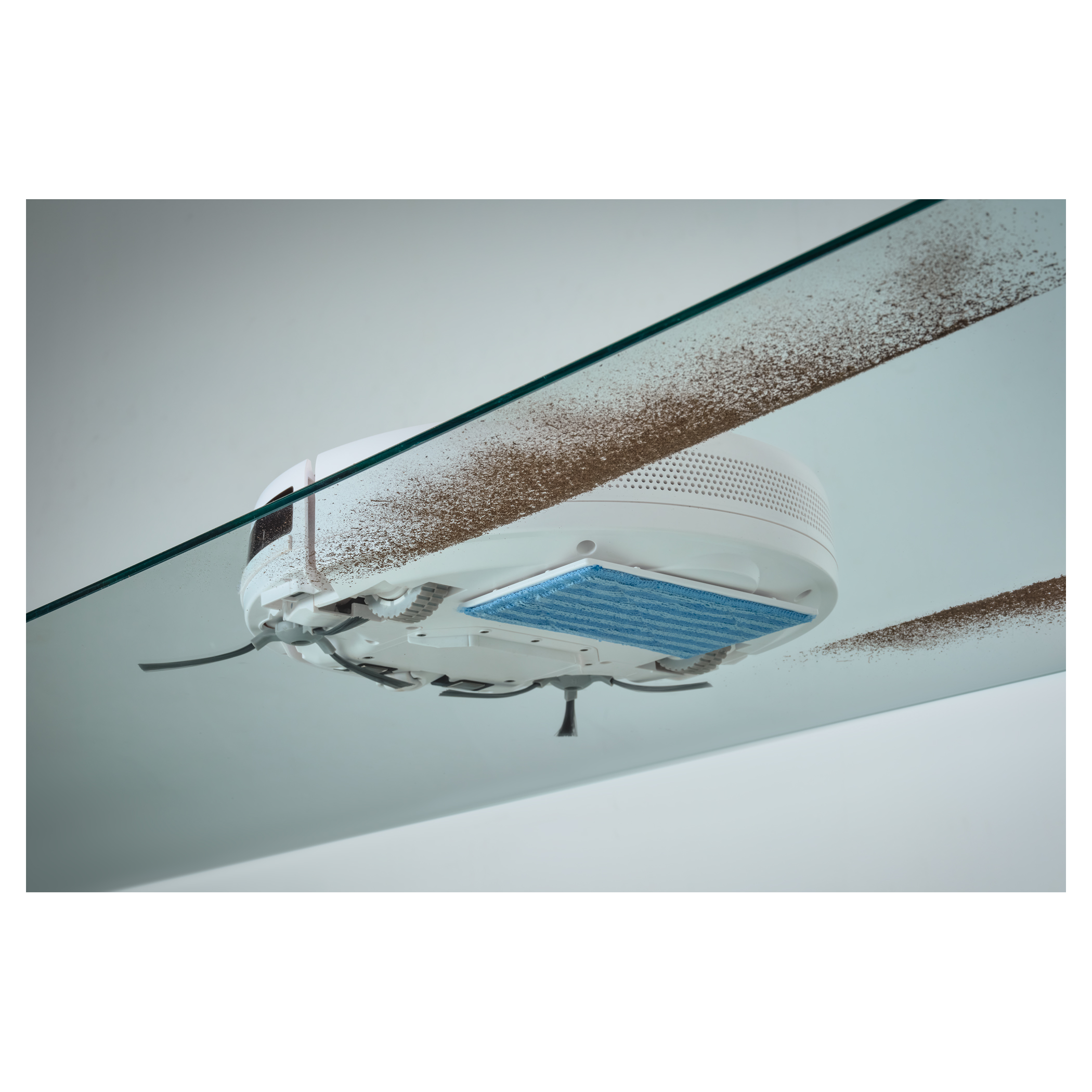 Usisivač se kreće samostalno, usisava prljavštinu i istovremeno briše prašinu antistatičkom krpom.