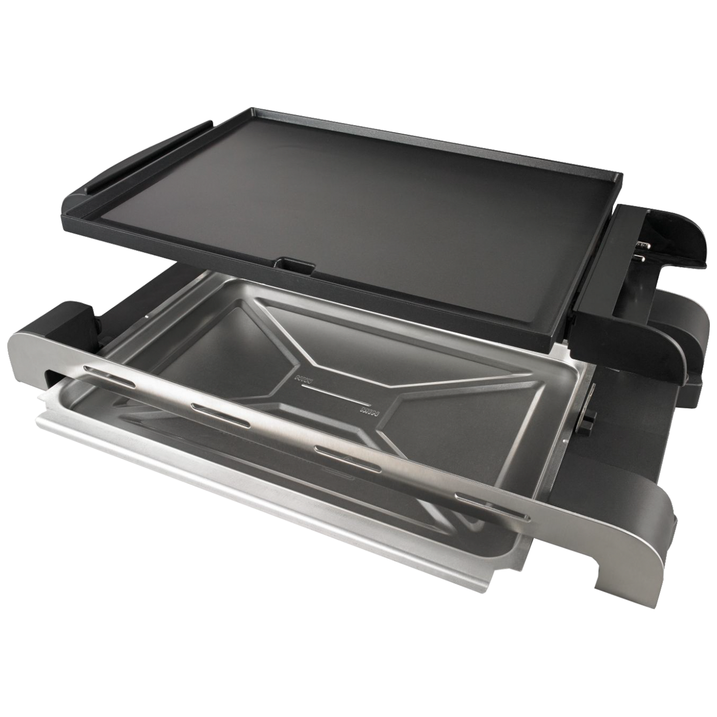 Električni roštilj sa ravnom pločom, priključna snaga 1400W, 5 nivoa temperature, podloga sa slojem protiv ljepljena namirnica, širina radne ploče 37 cm, dubina radne ploče za pečenje 27cm, toplotni indikator, odvodni kanal i prostor za skupljanje ulja, sigurnosno zatvaranje, gumirane nožice za stabilnost, hladne ručke za prenošenje, kućište od nehrđajućeg čelika