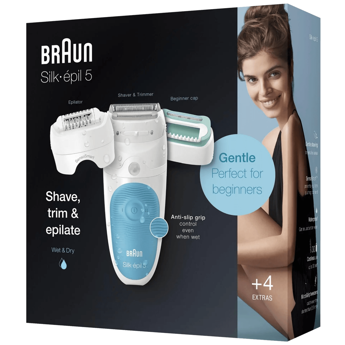 Ženski depilator s širokom depilacijskom glavom za iznimno brzu depilaciju. Braun Silk-epil 5–610 ima Micro-Grip pincetu, visookofrekvencijski masažni nastavak – dizajn je 100% vodootporan.