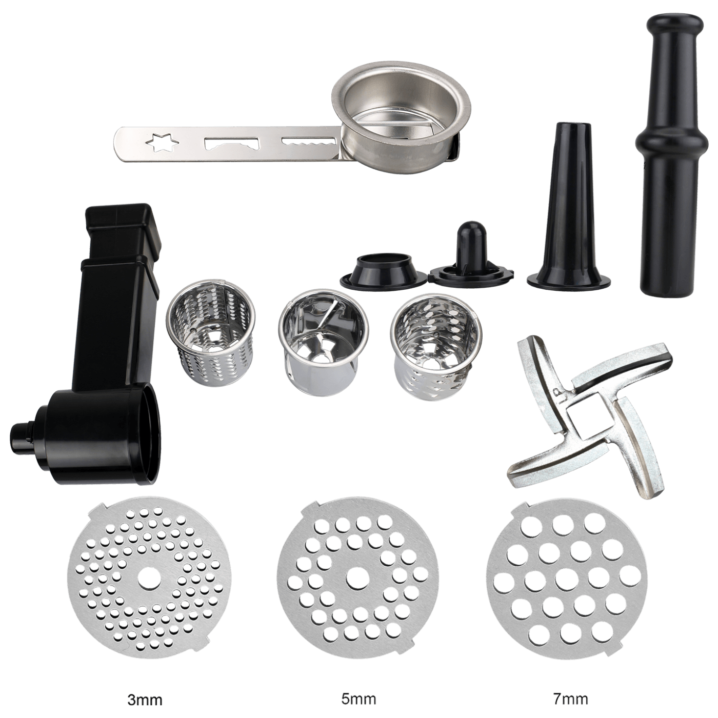 Mašina za mljevenje mesa, 9u1, snaga 2100 W, 3 brzine rada, kapacitet mljevenja 1.8 kg / min., noževi od nehrđajućeg čelika, dodatak za izradu kobasica i kibeh-a, gumene nogice protiv klizanja, 3 diska za rezanje 3 / 5 / 7 mm, potiskivač hrane, rezač za povrče i kolače, metalna četvrtasta ladica za hranu, razina buke 90 dB, napajanje 220 - 240 V / 50 - 60 Hz