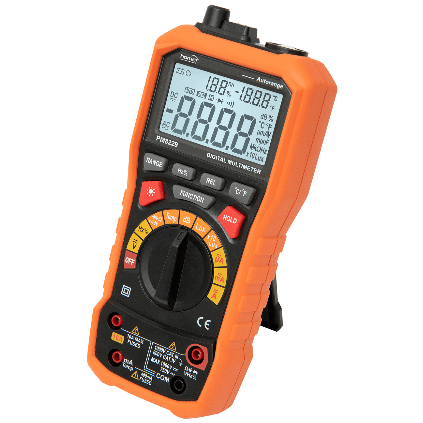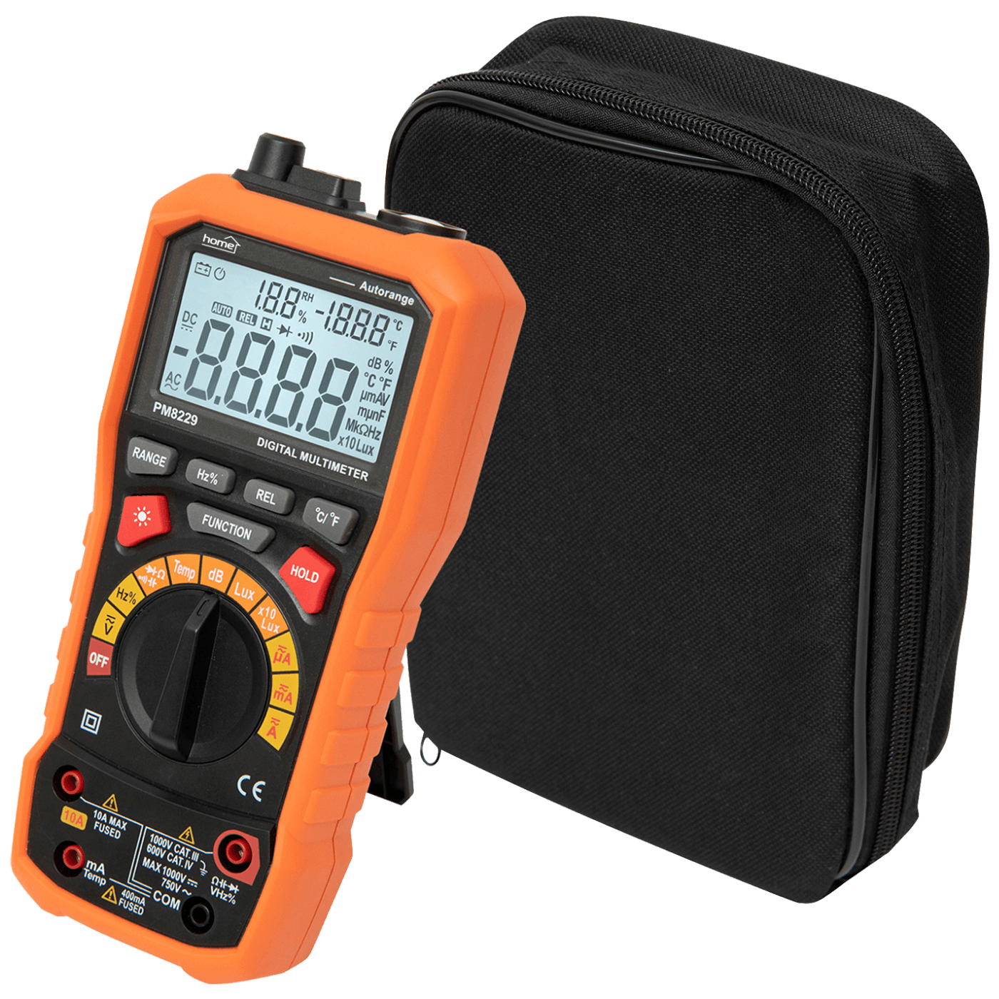 Profesionalni digitalni mjerni instrument, 6u1, puni opseg električnih mjerenja, temperatura i vlažnost okoline, površinska temperatura sa sondom, mjerenje zvučnog pritiska, mjerenje svjetline, namjenska traka za prikaz topline i vlage, veliki osvijetljeni zaslon, automatska ili ručna promjena raspona mjerenja, snimanje izmjerene vrijednosti, relativni način mjerenja, automatsko isključivanje, brisanje, čvrsti, gumirani poklopac, stražnji držač za ispitne vodove, rasklopivi nosač za stol