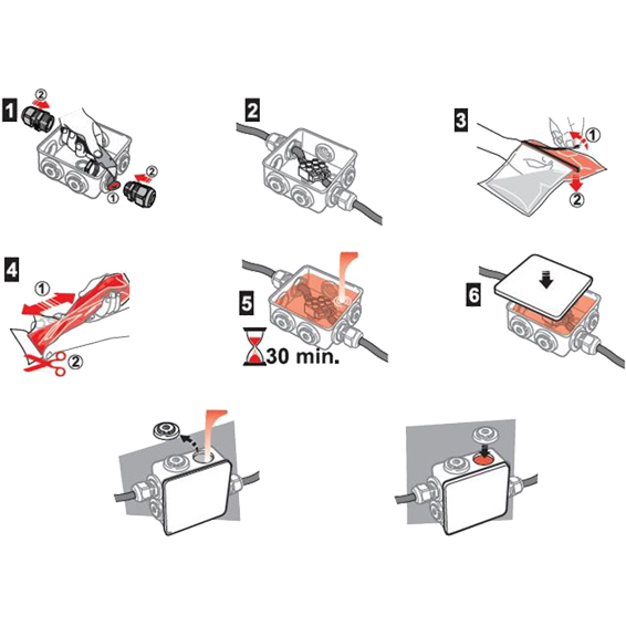 Razvodna kutija + C/GEL, nadžbuk 80x80x36, vodonepropusna , IP68 , upotrebom C/GEL-a hermetički zatvorena , mogućnost podvodne ugradnje.
