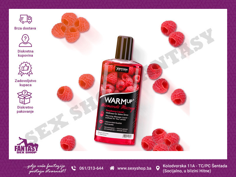 Ulje za erotsku masazu sa aromom maline od 150 ml. Kada se ulje nanese na kožu i počne trljati, ono dodatno pruža osećaj prijatne topline i blago zagrijava kožu. Na taj način tijelo se prijatno opušta a efekat masaže je znatno bolji. Koža je poslije tretmana prijatno glatka i meka.