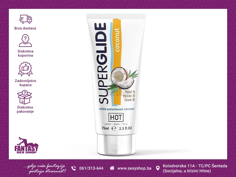 Jestivi lubrikant Superglide by HOT, na vodenoj bazi sa aromom kokosa. Pakovanje 75ml, made in Germany.