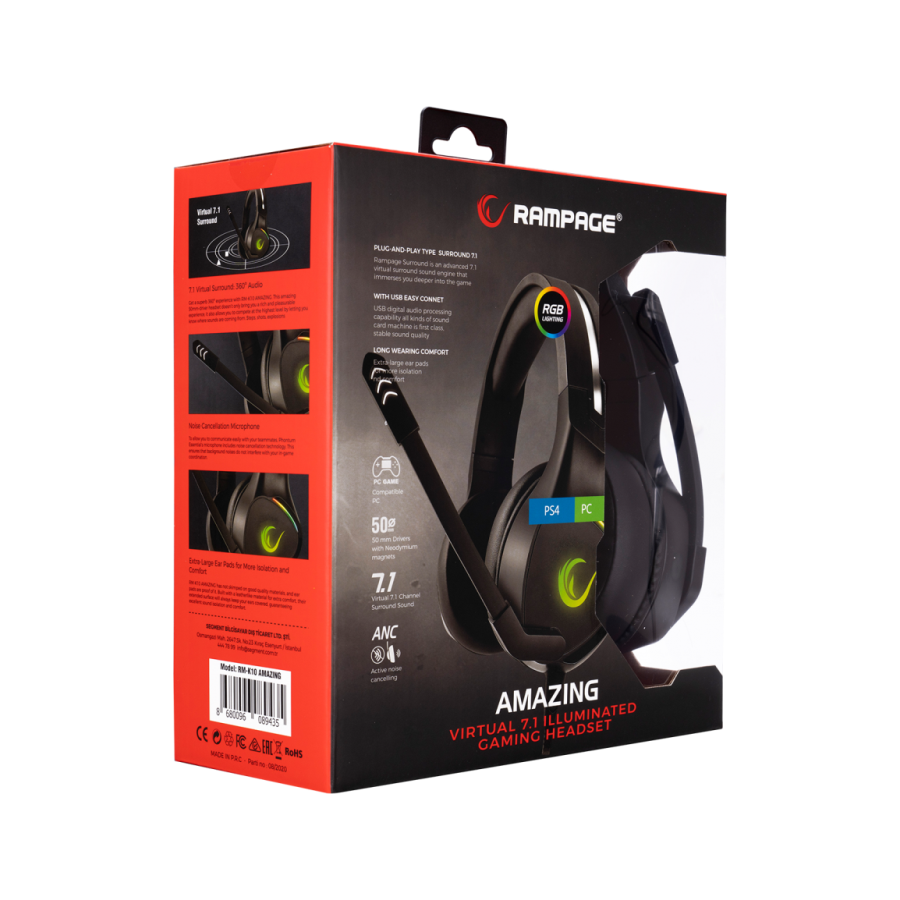 Slušalice sa mikrofonom gaming RAMPAGE RM-K10 PC/PS4 AMAZING Black USB 7.1 Noise-Cancelling Mic, RGB LED