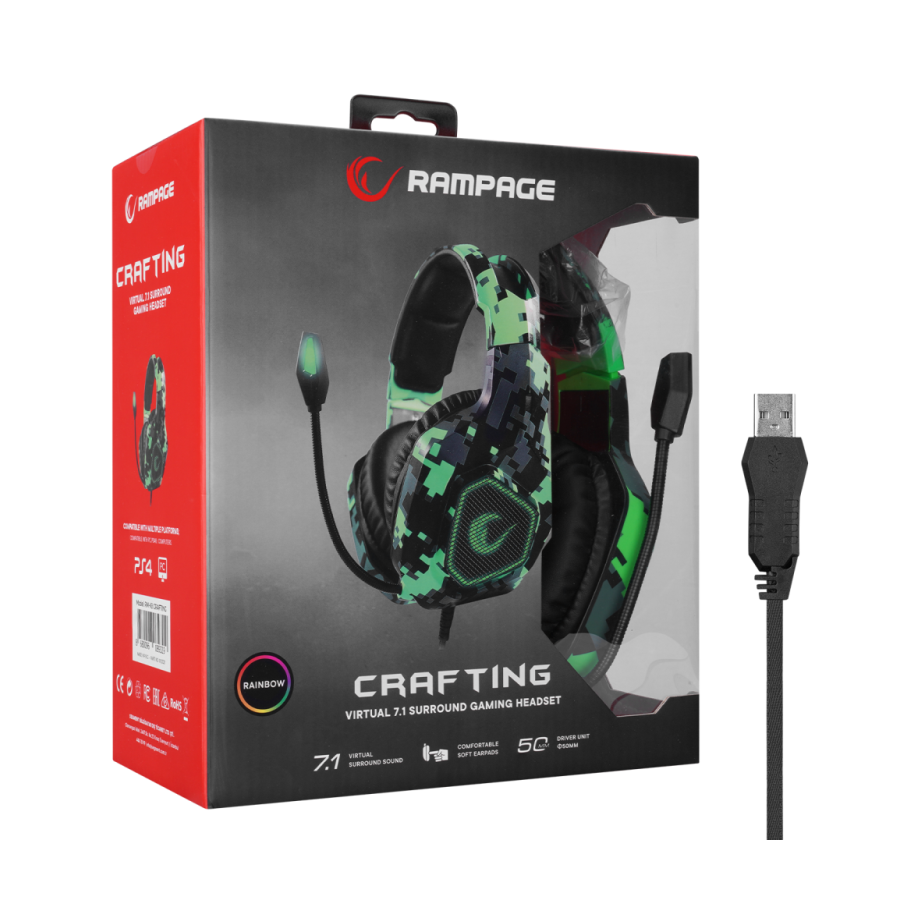 Slušalice sa mikrofonom gaming RAMPAGE RM-K8 CRAFTING camo, PC/PS4, USB, 7.1, Rainbow LED