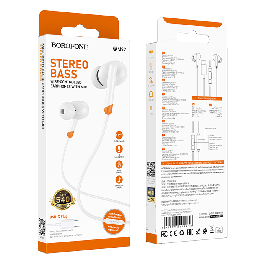 Slušalice sa mikrofonom Type-C BOROFONE BM92 Refined universal earphones with microphone Type-C white