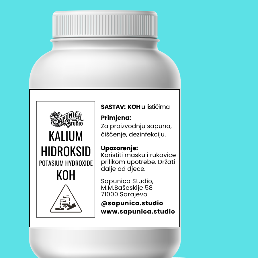 Kalijum hidroksid, poznat i kao kaustična potaša ili KOH, je visokokvalitetna alkalna supstanca neophodna u procesu pravljenja sapuna metodom hladnog ili toplog procesa. U kombinaciji s biljnim uljima i puterima, omogućava saponifikaciju – hemijsku reakciju kojom nastaje prirodni sapun i glicerin.
