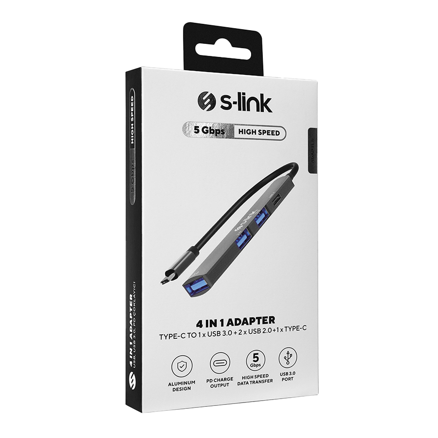USB HUB S-link SWV-USBC023 4 in 1 Gray Metal TypeC to 2*USB2.0 USB 3.0, PD Type C Adapter, 39871