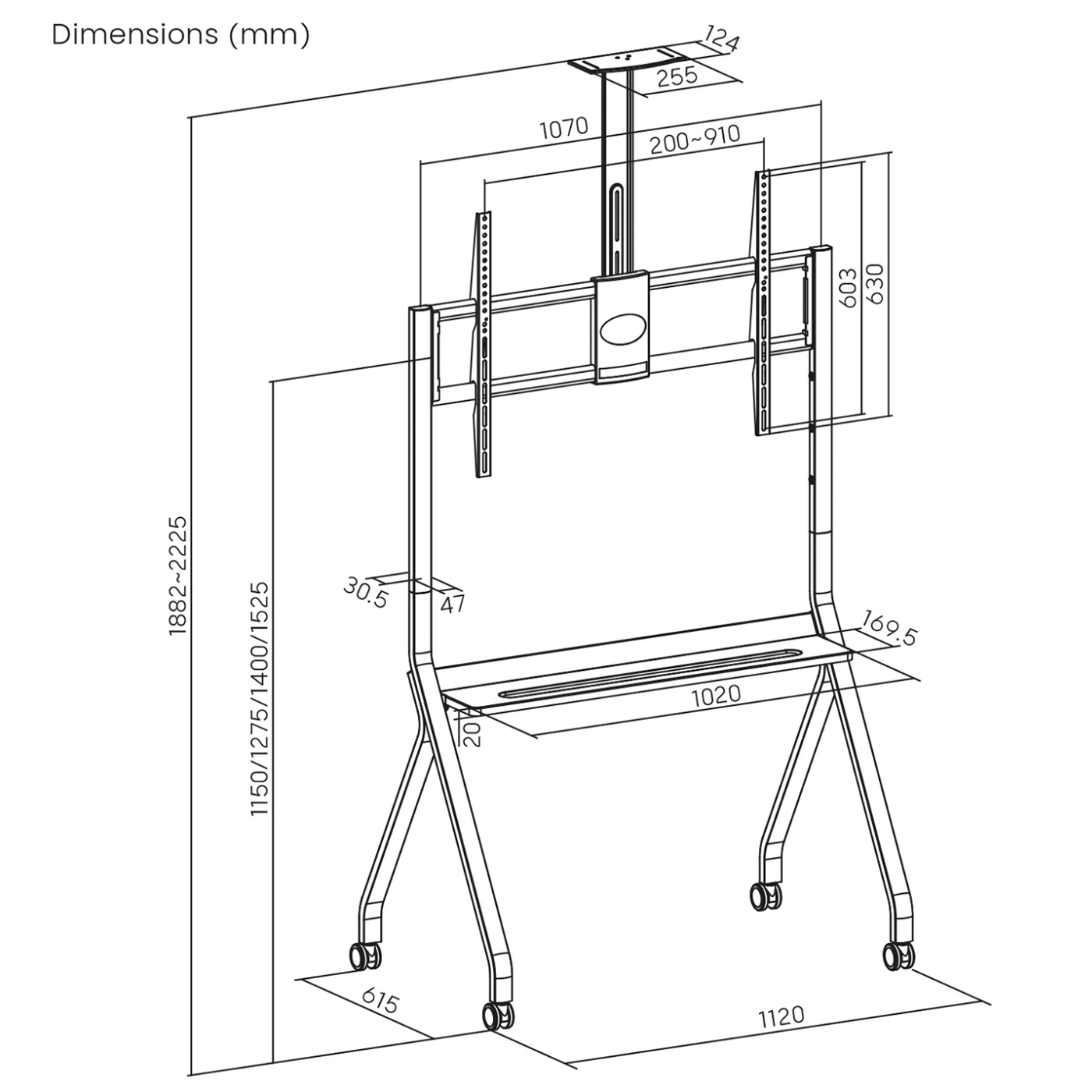 TV se može montirati na jedan od četiri visinska položaja (1150 / 1275 / 1400 / 1525 mm), prilagođavajući ga visini gledanja i uvjetima prostora. Uređaj ima maksimalno opterećenje do 120 kg na nosač, dok dodatna polica može nositi do 10 kg, idealno za postavljanje kamere, dekodera, playera ili drugih periferija. Stalak podržava VESA montažu do 900 × 600 mm, što osigurava kompatibilnost sa širokim spektrom velikih televizora.