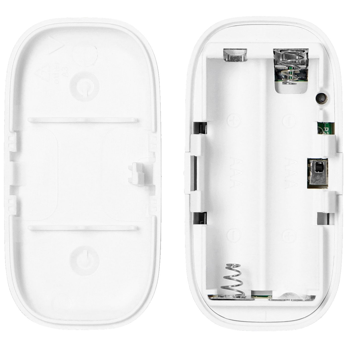 Dimenzije uređaja su 31x21 mm. Napaja se s 2xAAA baterije. Mat bijela boja. Montira se na 3M ljepilo.