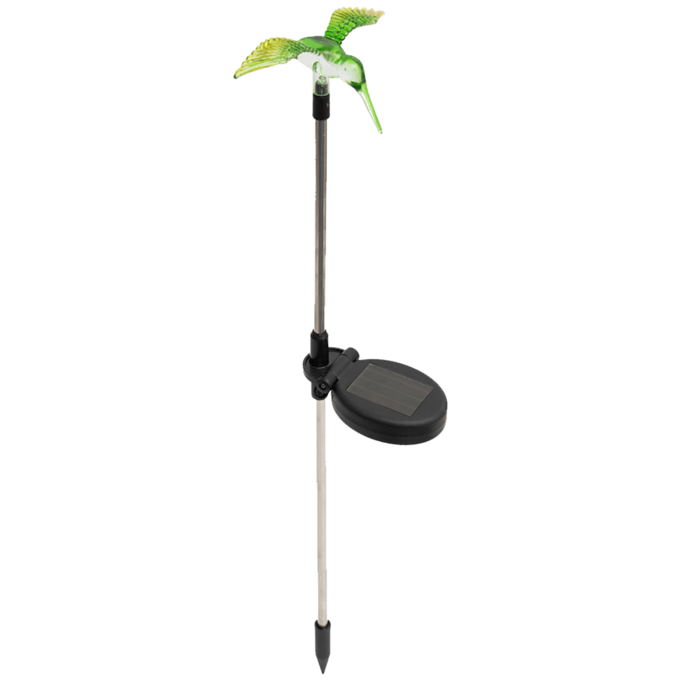 Solarna dekorativna svjetiljka, ptica kolibri, automatsko uključivanje i isključivanje, do 8 sati neprekidnog rada, ugrađena solarna ćelija i punjač za bateriju, zamjenjiva NI-MH AA baterija 1,2V / 600 mAh, izvor svjetla LED, otporno na atmosferske utjecaje, visina 50 cm, materijal izrade metal / plastika, ubodna u zemlju