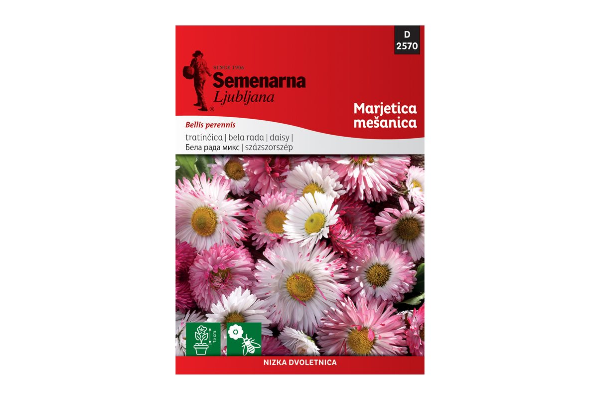 Ova višegodišnja zeljasta biljka je nastala od obične livadske bele rade. Postoje kultivari ove biljke koji su crvene, roze, ružičaste, ljubičaste i bele boje. Razlikuju se od obične livadske biljke po izgledu cveta koji su punih, kuglastih oblika. Vrsta semena: Seme cveća
